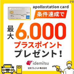 還元率基本0.5%(1,000円ごとに5ポイント、1ポイント=1円相当)、apollostation給油時利用で追加還元(ガソリン・軽油2円/L引き相当)